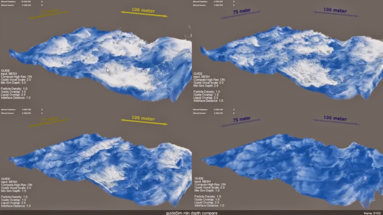 Artists can now add froth, foam, and bubbles to liquid simulations, creating even more realism and detail in scenes with oceans, beaches, lakes, and stormy seas. With camera adaptivity, artists can create high resolution simulations close to the camera where detail is essential, while lowering the computation of foam particles in other ares, resulting in shorter simulation times.